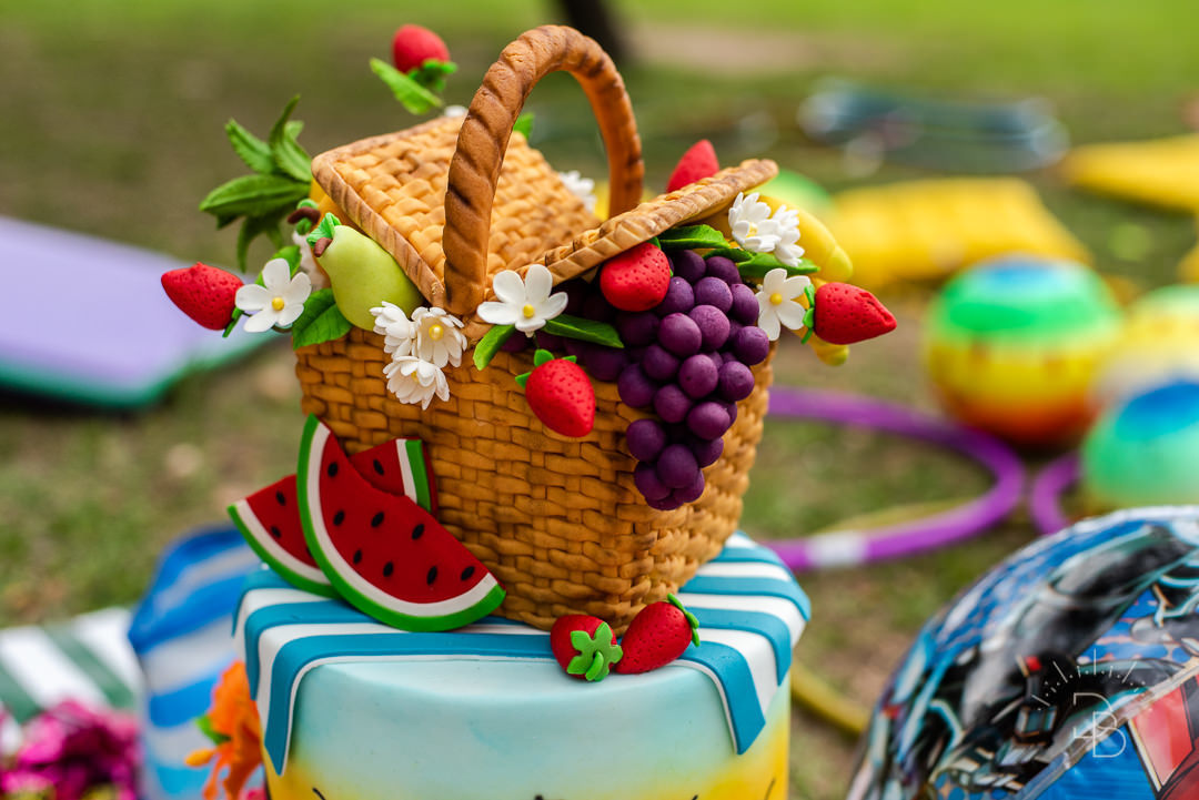 O tema tropical trouxe ainda mais cor e alegria para esse dia especial. Almofadas espalhadas pelo gramado, listras vibrantes, frutas, flores e muitos detalhes cheios de charme criaram um cenário leve, divertido e cheio de personalidade.