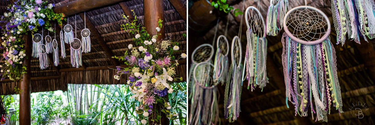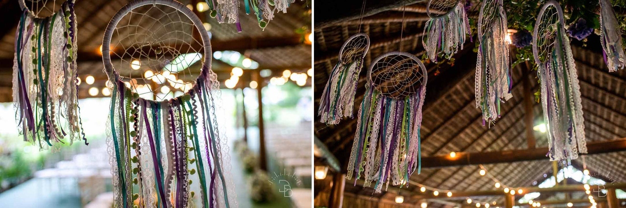 Na área da cerimônia vários bastidores de filtro dos sonhos com fitas em tie die enfeitavam esse cantinho muito especial: o cantinho do SIM, ACEITO.