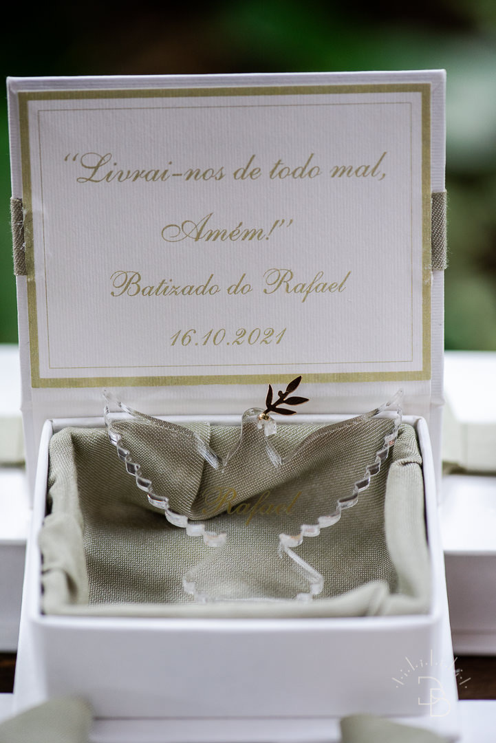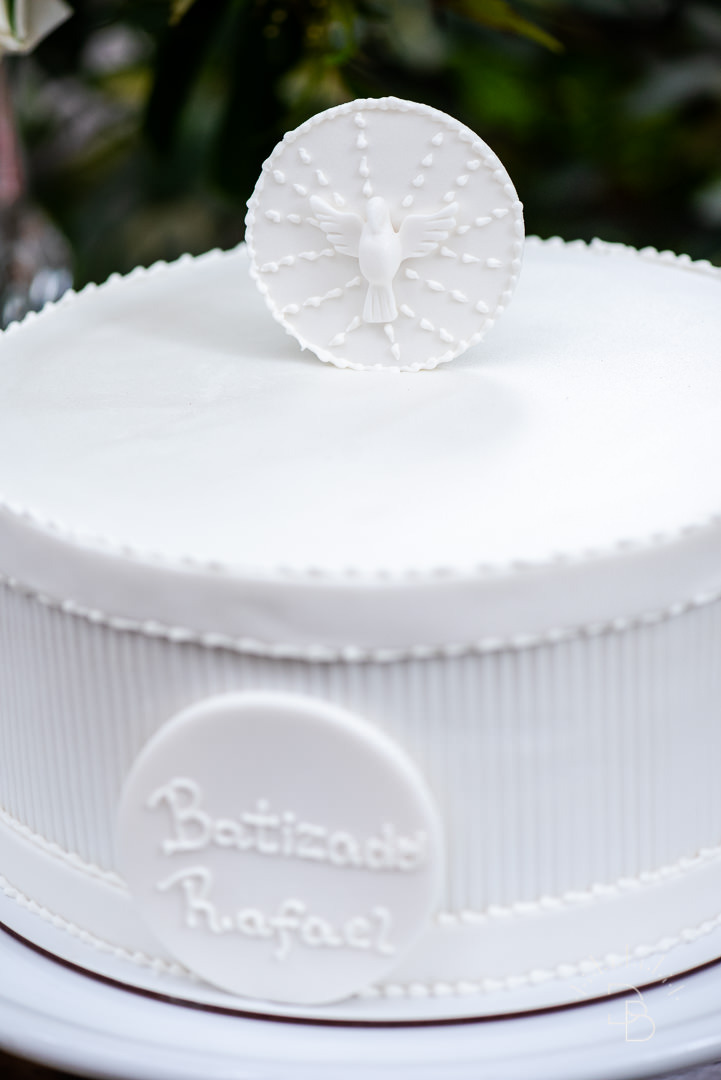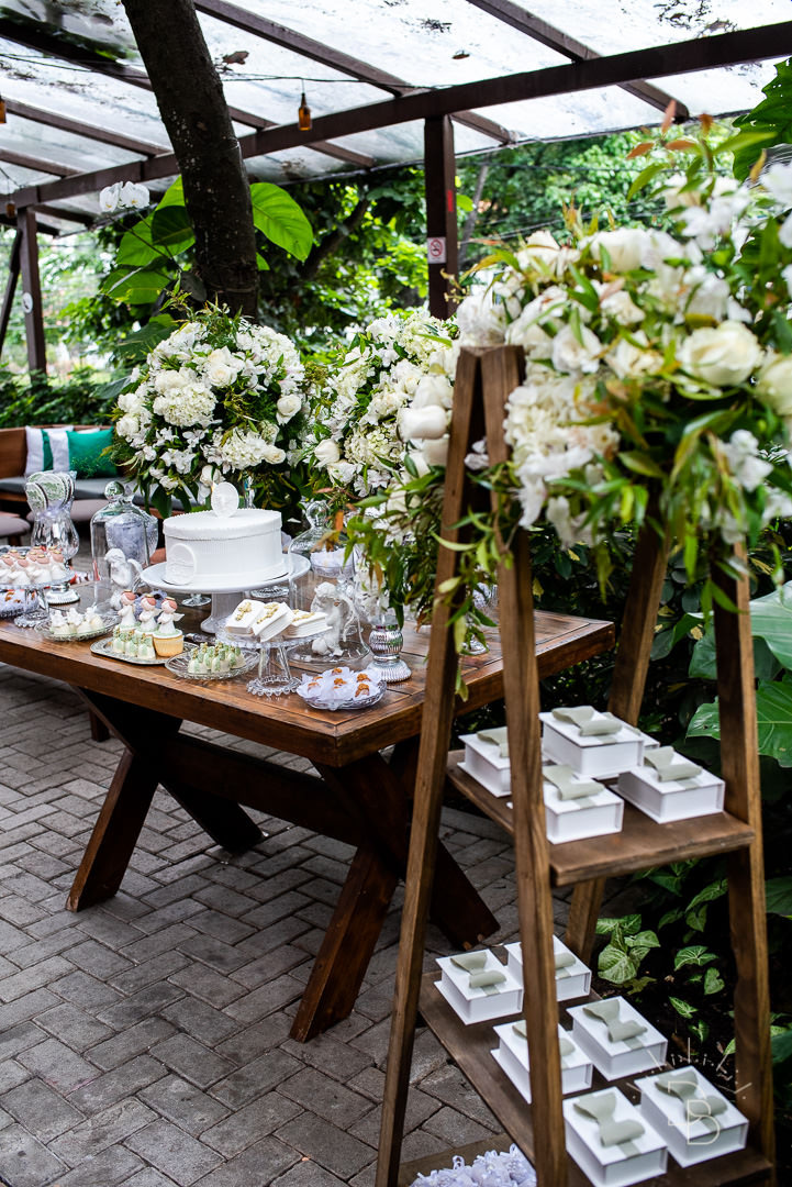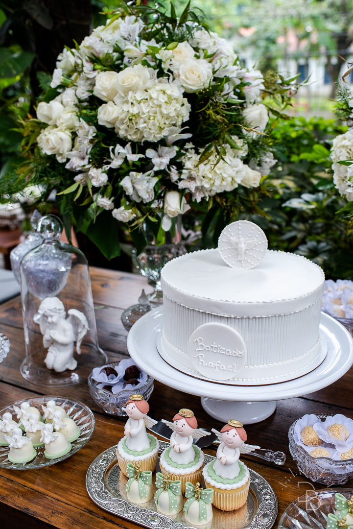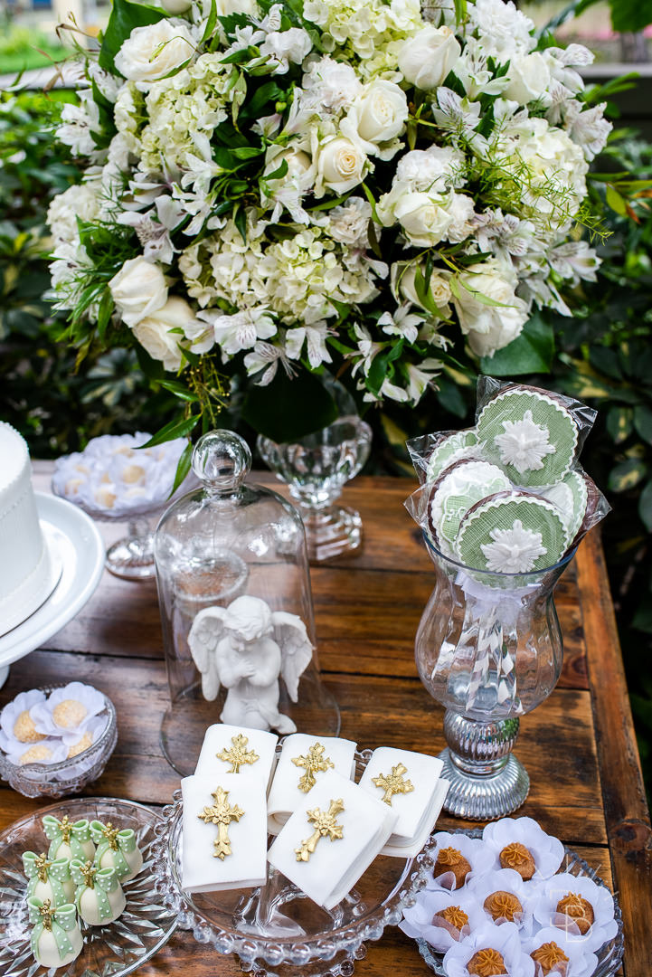 Para salvar na pastinha de inspiração: uma decoração toda branquinha com verde para o Batizado do Rafael.