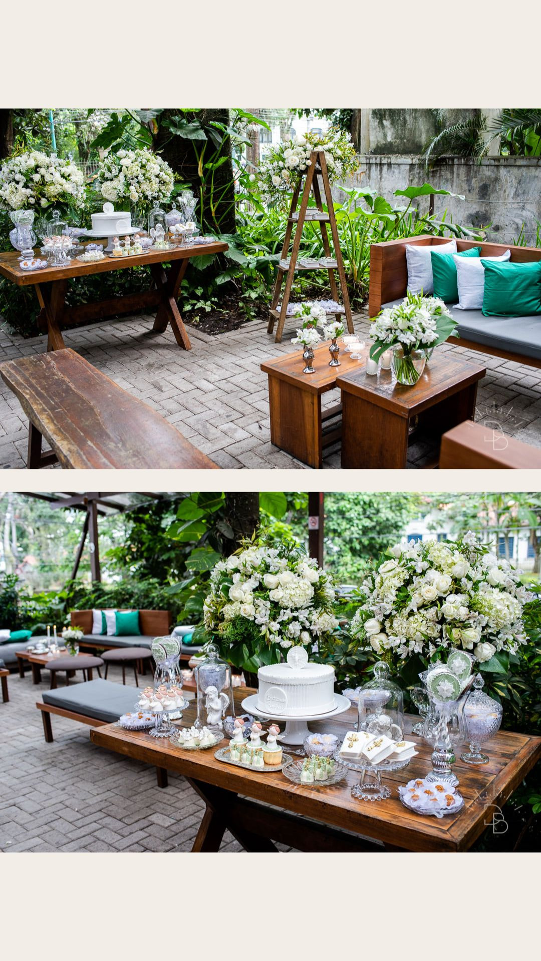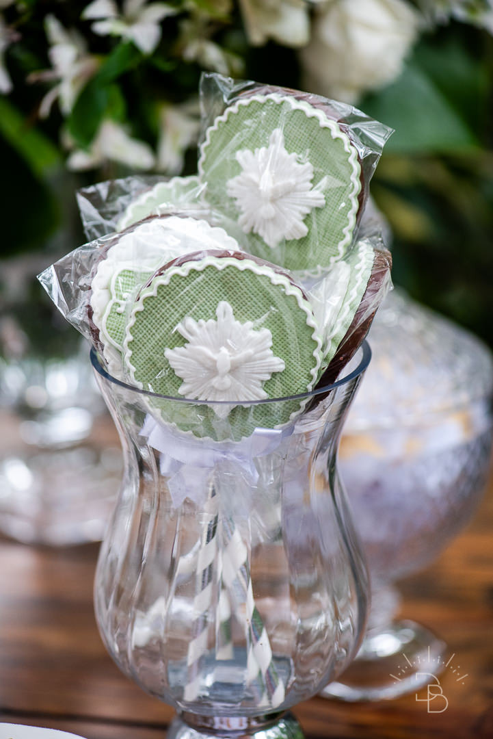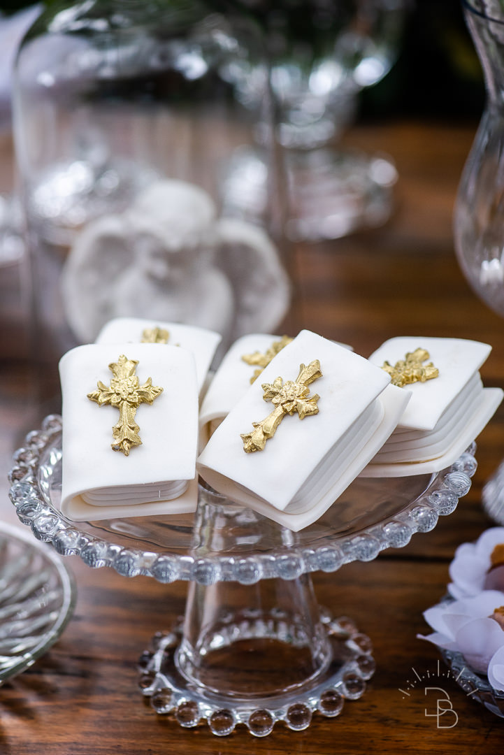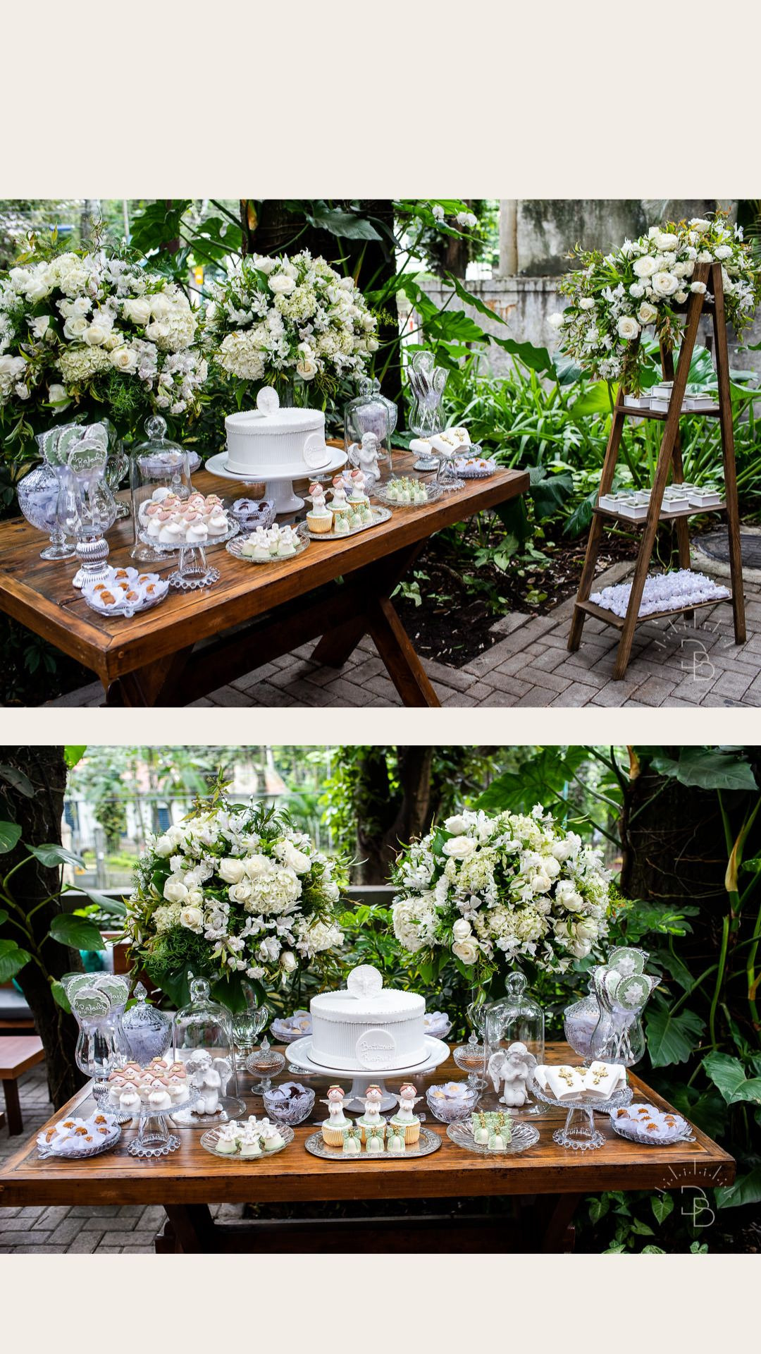 Para salvar na pastinha de inspiração: uma decoração toda branquinha com verde para o Batizado do Rafael.