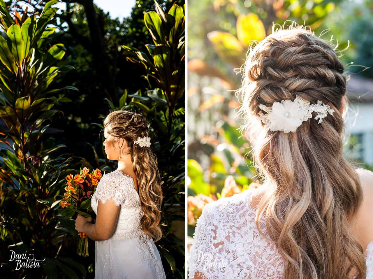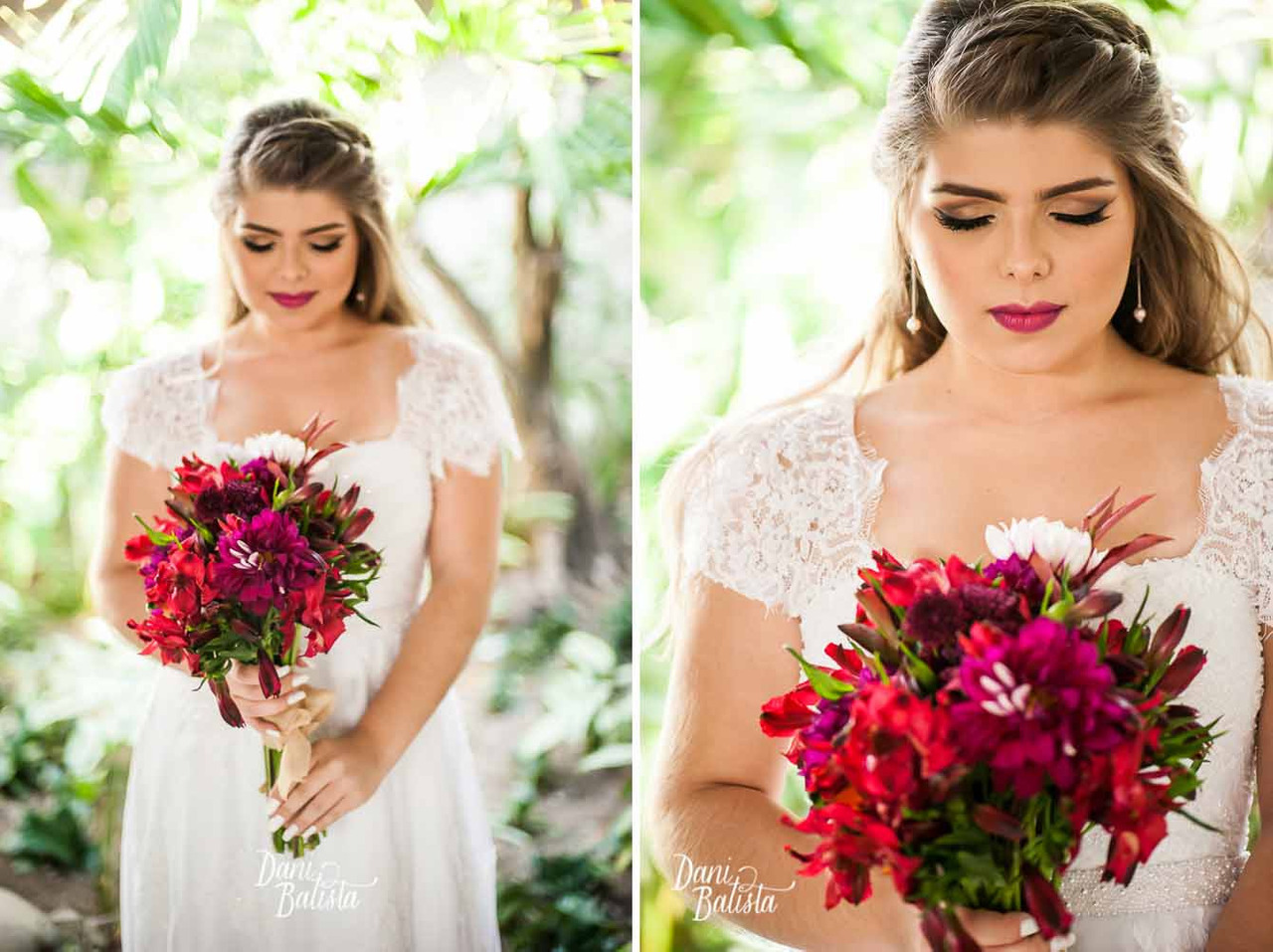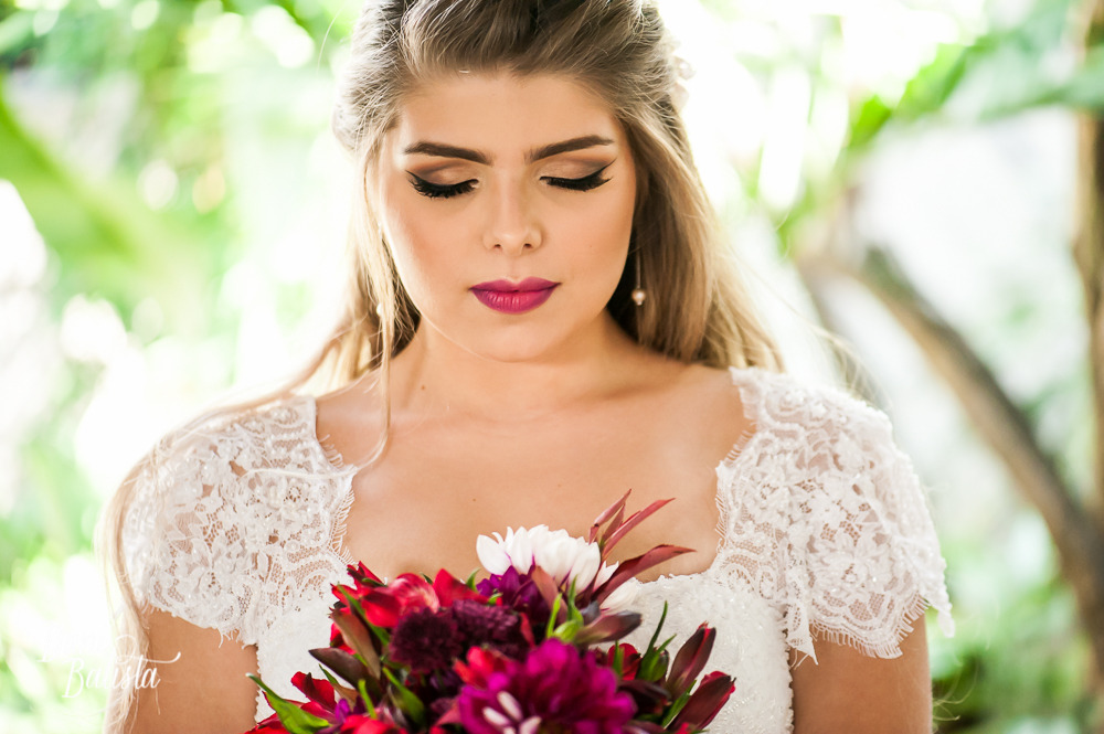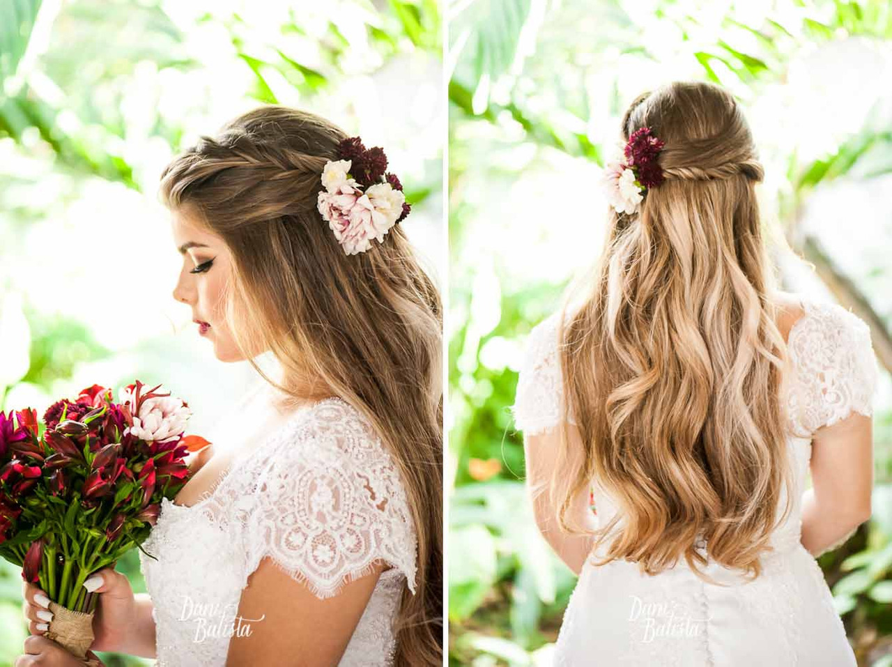 1. Para noivas mais básicas: penteado semi-preso natural + Maquiagem leve em tons quentes com toque de cor fria na boca para combinar com o bouquet em tons frios.