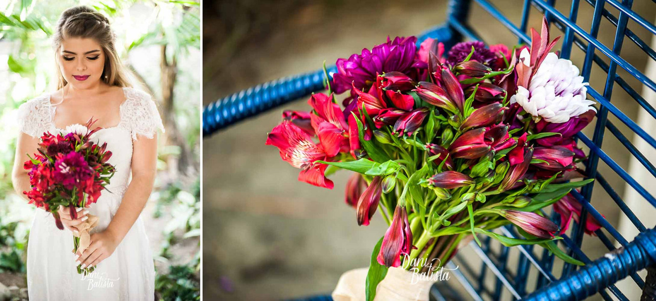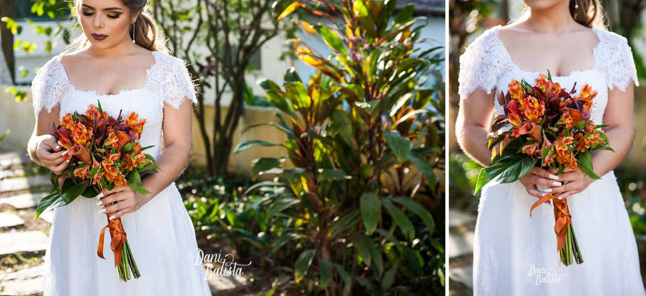 Os dois bouquets desconstruídos e românticos, confeccionados pela Renata Delduque, que além de cerimonialista possui uma empresa de arranjos florais (a Florelia Flores e Decoração), foram em tons frios e quentes para “casar" com a maquiagem, mostrando que é possível fazer um bouquet moderno, leve e elegante, utilizando diferentes flores da estação.